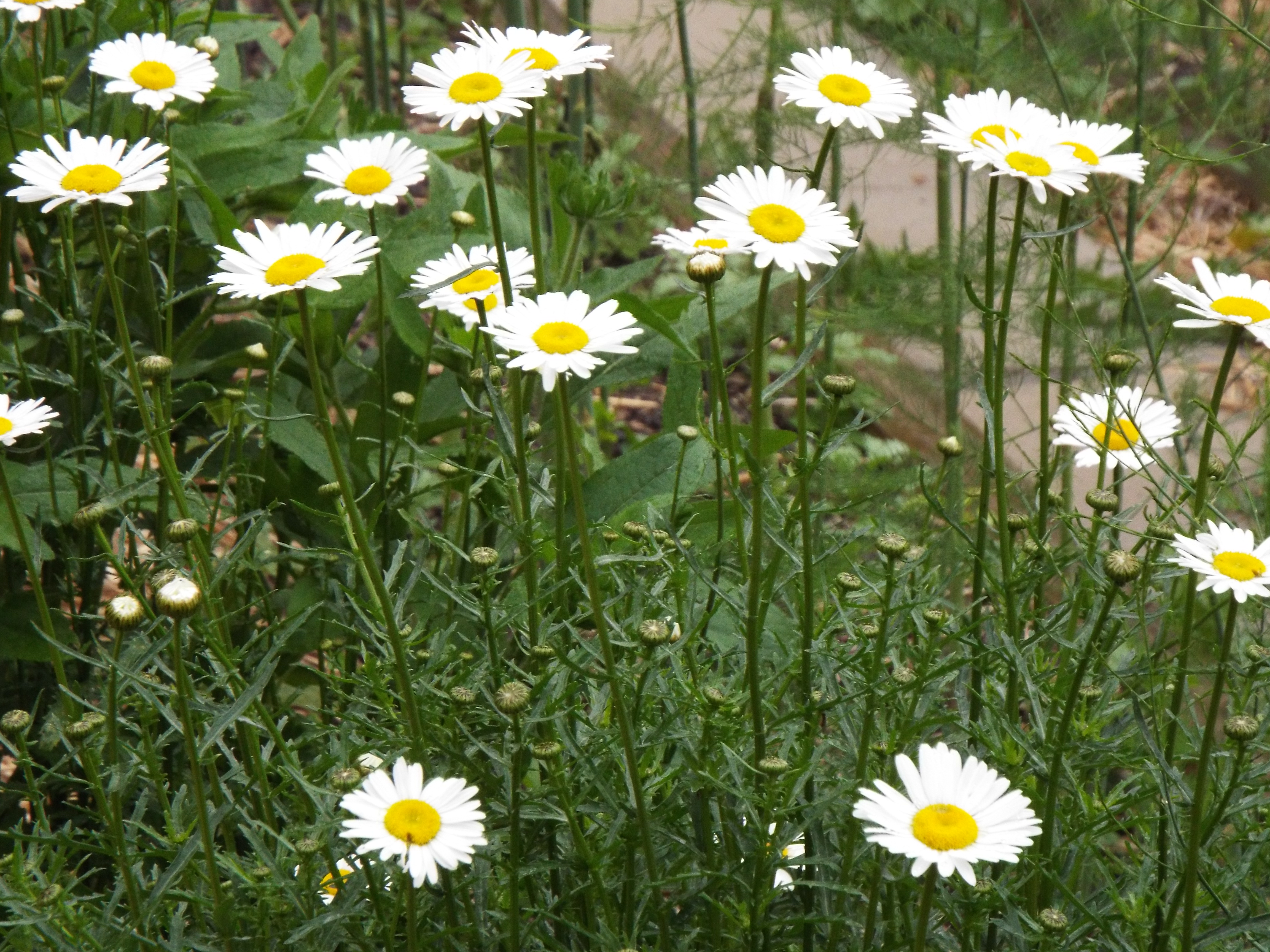 Published June 21, 2018 at 4608 × 3456 in Our Garden in June ← Previous Next → We grow flowers in the veggie garden to encourage pollinators, but these wild daisies are a natural occurrence. I just love them.