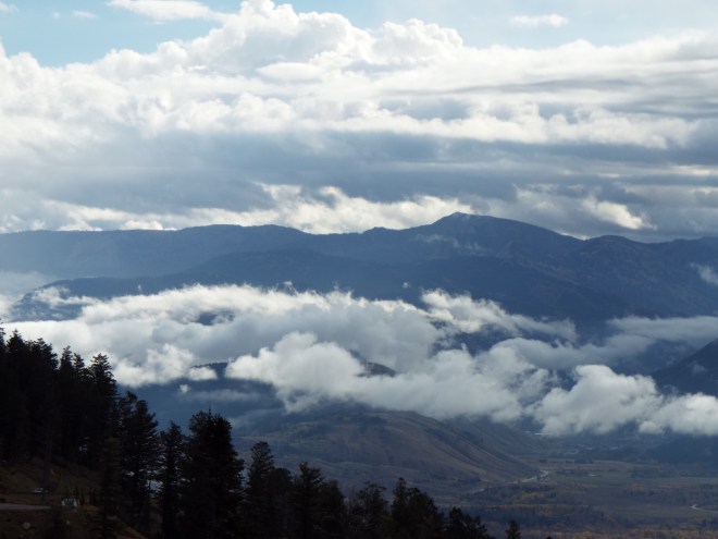 We traveled through a portion of the Grand Tetons on our way to Yellowstone. It was a cloudy, foggy, misty day so the view was a little different than it would be on sunny days, but still stunning in its own way.