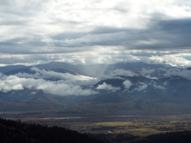 Leaving our final “cousin destination” in western Montana, we opted for a more southerly route home so we could see more new-to-us parts of the country—a very good idea, it turned out. One of the many unexpected and spectacular sights we encountered was Mt. Borah. Located in the Challis National Forest in eastern Custer County, Mt. Borah is Idaho’s highest mountain. Though it was only rainy down where we were, way up at 12, 667 feet above sea level, snow was beginning to cover the peaks.